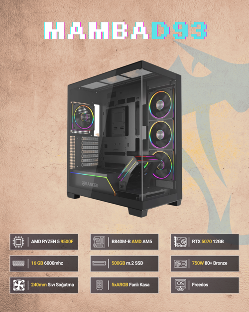 Sinerji Mamba D93 oyuncu bilgisayarı, yüksek performans arayan oyuncular için tasarlanmış güçlü bir sistemdir. Ryzen 5 9500F işlemcisi ile donatılan bu sistem, modern oyunların ve ağır uygulamaların sorunsuz çalışmasını sağlar. 16GB RAM kapasitesi, çoklu görev yönetiminde üstün performans sunarken, 500GB SSD ile hızlı açılış süreleri ve veri transferi deneyimleyeceksiniz. RTX 5070 ekran kartı, en son oyunları yüksek grafik ayarlarında akıcı bir şekilde oynamanızı mümkün kılar. 240MM sıvı soğutma sistemi, yoğun oyun seansları sırasında bile sistemin serin kalmasını ve optimum performansta çalışmasını garanti eder. FreeDOS işletim sistemi ile gelen bu bilgisayar, tercih ettiğiniz işletim sistemini yükleme özgürlüğü sunar. OEM paket olarak sunulan bu oyuncu bilgisayarı, rekabetçi oyunlar ve yüksek kaliteli görsel deneyimler için ideal bir seçimdir.