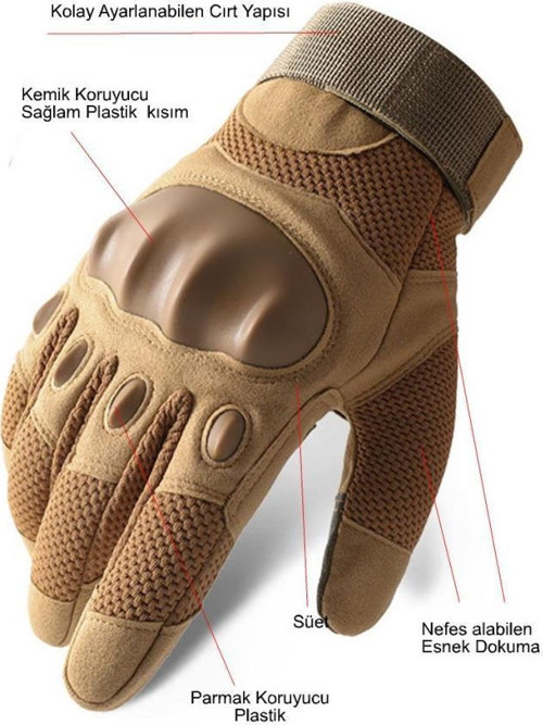 - Tam Parmak Tasarım: Tüm elinizi güvenle saran tam parmak tasarımı, maksimum koruma ve esneklik sunar.