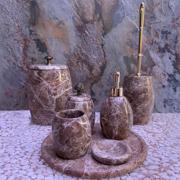 1 adet mermer tepsi + 1 adet mermer katı sabunluk + 1 adet mermer sıvı sabunluk + 1 adet mermer diş fırçalık + 1 adet kapaklı mermer pamukluk + 1 adet kapaklı mermer çöp kutusu + 1 adet mermer klozet fırçalıktan oluşmaktadır. - Tüm ürünlerimizin görselleri atölyelerimiz ve showroomumuzdaki kendi çekimlerimizden oluşmaktadır. - Doğal Taşın yapısı sebebiyle tüm Doğal Taş ürünlerde renk tonu ve damar yapısı birbirinden +/- %10 farklı olabilir. Her ürün benzersiz ve size özeldir. Temizlik ve Bakım: - Tüm Doğal Taş ürünlerin temizliğinde, aşındırıcı asit vb. kimyasallar içeren temizlik ürünlerinin kullanımından kaçınınız! - Islak bir bez veya sünger yardımıyla kolayca temizleyebilirsiniz. - Daha zorlu lekelerde ise bulaşık deterjanı, sıvı sabun vb. yumuşak temizlik ürünlerini kullanabilirsiniz.