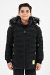Siyah Erkek Çocuk Çıkartılabilir Kapüşonlu Şişme Deri Karışımlı Kumaş Mont&Kaban