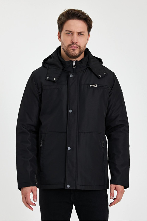 Sivaist Siyah İçi Kalın Kürklü Çıkartılabilir Kapüşonlu Fermuar Çepli Rüzgar Ve Su Geçirmez Mont&Kaban