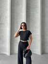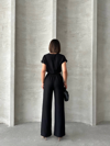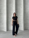 İntive lingerie-innocent&attractive Siyah Beli Bağcıklı ve Büzgülü Geniş Paça Pantolon Kısa Kollu Yazlık Bluz Takım