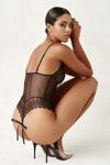 Farklı kesimi ve detaylı desenleriyle oldukça ilgi çekici, transparan görüntüsüyle cesur bir yapıya sahip siyah renk desenli ve dantelli kadın iç çamaşırı takımı.