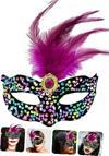 - Pembe tüyler ve pembe taşlar maskeye lüks ve göz alıcı bir görünüm kazandırır.