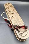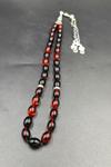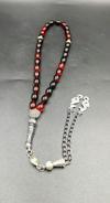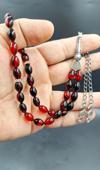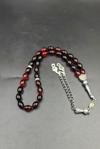 Üretildiği malzeme: Ateş kehribar Ana renk: Siyah Kırmızı İmame maddesi: Alpaka Tane ölçüsü: 8x12 Toplam uzunluk: 36 cm Ağırlık: 33 gram;