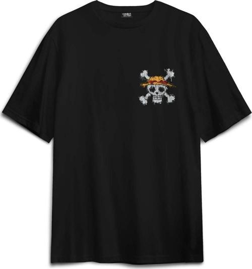 - Siyah Oversize Tişört Şapkalı One Piece Anime Sırt Ön Baskılı Relax Fit T-shirt - OVR12S-4308