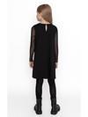 Kolları şeffaf tülden, göğüs kısmı simli püsküllü kumaştan üretimiştir. Elbisenin arka kısmı kadifedir.
