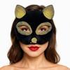 - Siyah süet ve gold simlerle süslenmiş sevimli bir kedi maskesi tasarımı.