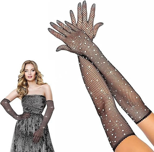 Siyah Renk İncili Elmas İşlemeli File Örgü Uzun Eldiven