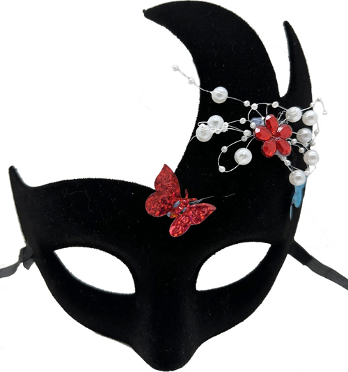 - Siyah süet kaplama ve inci ve taşlarla süslenmiş göz alıcı bir Venedik maskesi tasarımı.