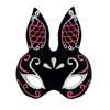 Bu siyah süet kaplama tavşan maskesi, kırmızı ve beyaz simlerle süslenmiş göz alıcı bir tasarıma sahiptir. 18x16 cm boyutlarındadır ve çoğu yetişkine uygundur.