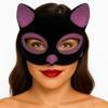 - Siyah süet ve pembe simlerle süslenmiş sevimli bir kedi maskesi tasarımı.