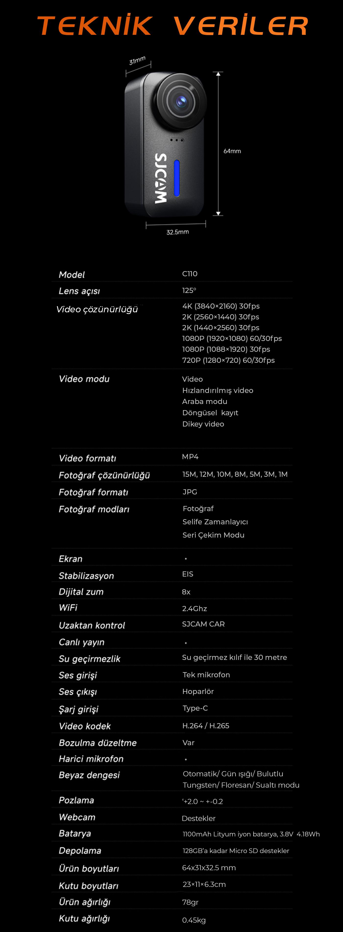 SJCAM C110, 4K çözünürlük ve EIS (Elektronik Görüntü Sabitleme) teknolojisi ile olağanüstü bir aksiyon kamerasıdır. Yalnızca 64×30×33 mm boyutlarındaki kompakt ve taşınabilir tasarımı, her anınızı kolayca kaydetmenizi sağlar. 125° geniş açılı lensi ile her ayrıntıyı net bir şekilde yakalayabilir ve 30 metreye kadar su geçirmez yapısıyla zorlu dış mekan koşullarına dayanıklıdır.