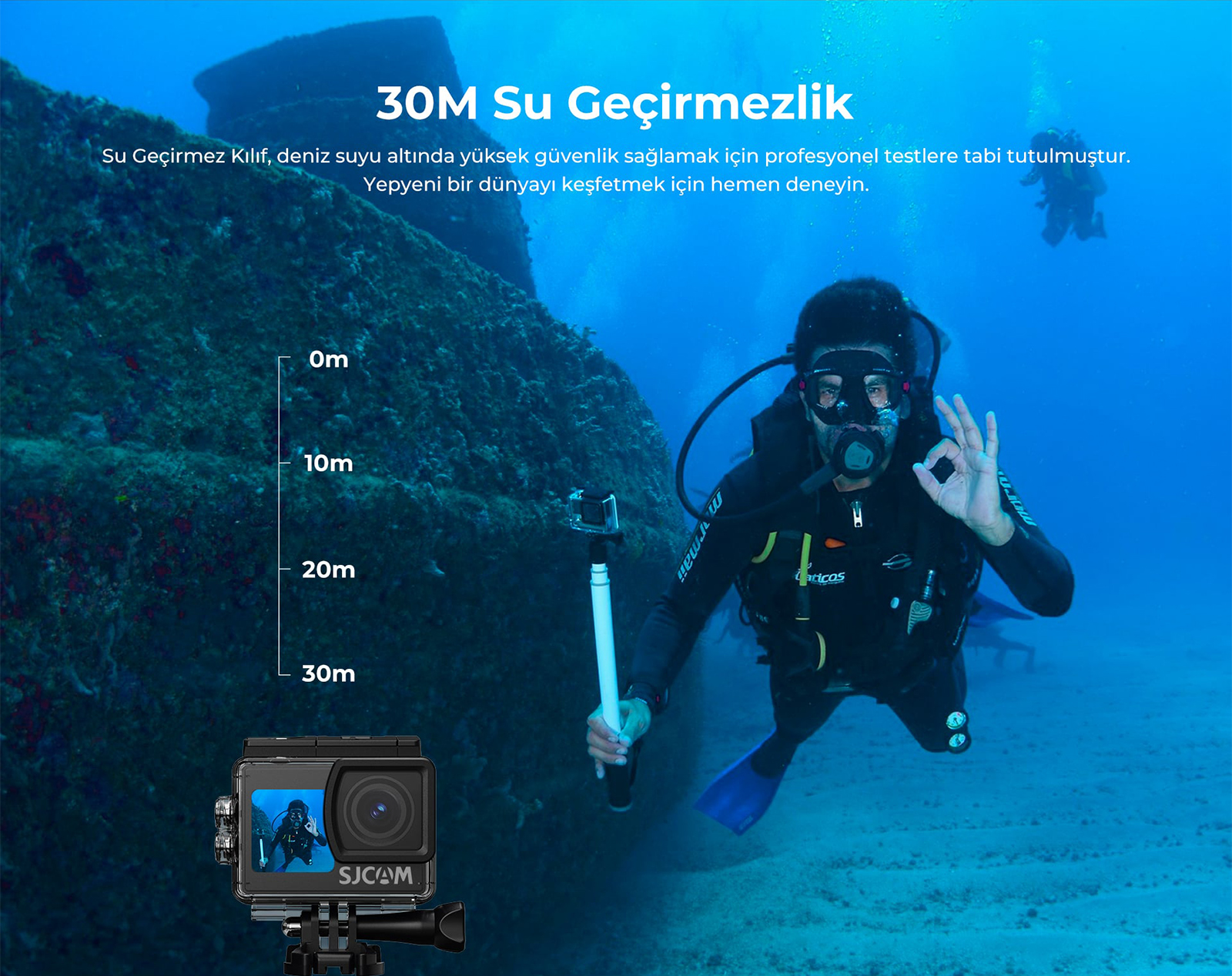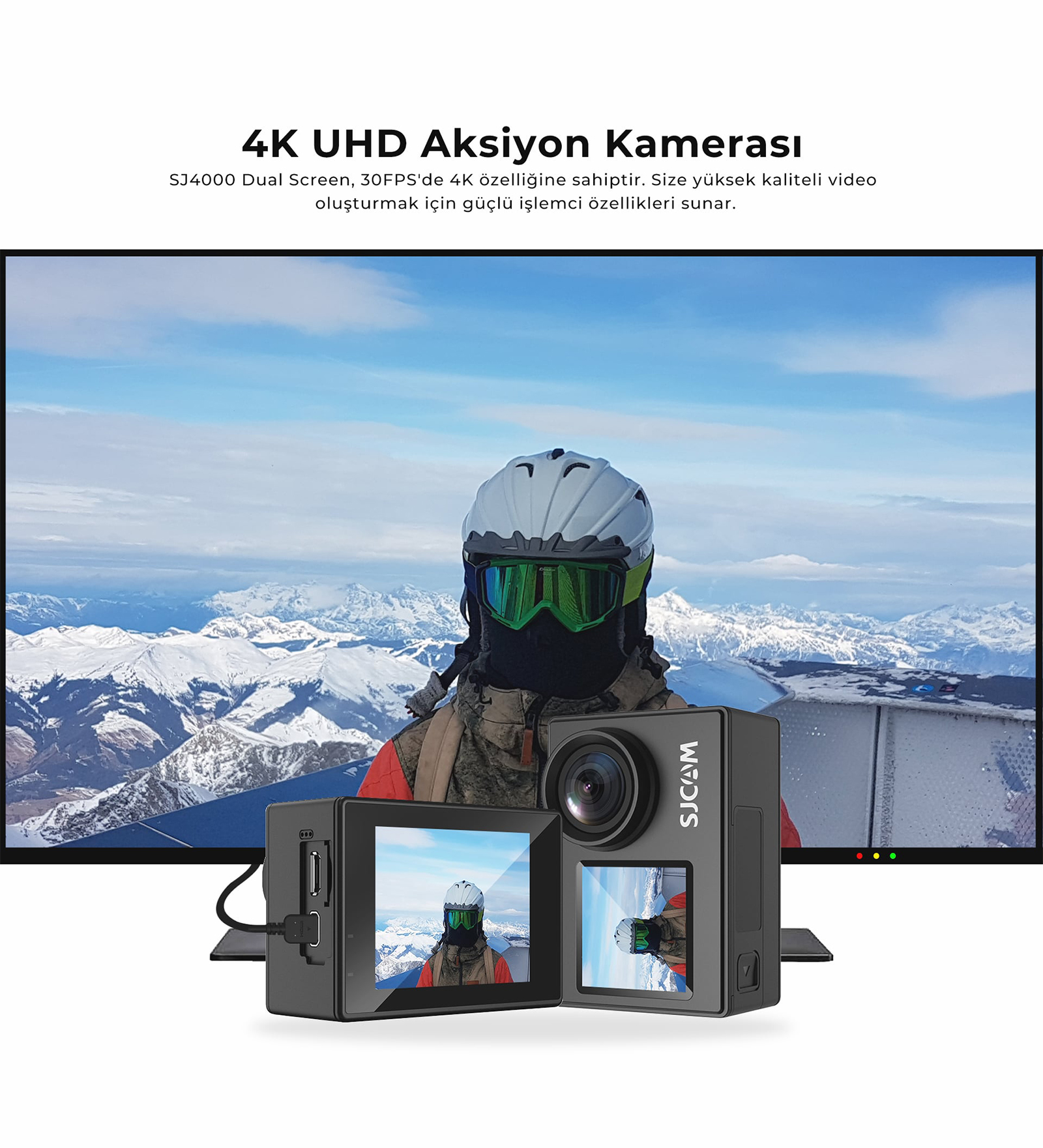 SJCAM SJ4000 Dual Screen WiFi 4K Aksiyon Kamerası, 4K 30fps video desteğiyle yalnızca net değil, aynı zamanda hayal edebileceğinizden daha fazla ayrıntı ve akıcılığa sahiptir. 2.0'' HD ana ekran ve 1.3'' ön ekranla donatılmış olarak, istediğiniz zaman nasıl çekim yaptığınızı görebilir ve çekimlerinizde ustalaşabilirsiniz. SJCAM Zone mobil uygulamasıyla, kamerayı WiFi üzerinden 10 metre mesafeye kadar uzaktan kontrol edebilirsiniz. Her türlü geniş sahneyi kaydeden geniş açısı, size şok edici bir görsel zevk sunar. Özel su geçirmez kılıf ile kullanıldığında ve 30 metre derinliğe kadar su geçirmezliği bulunmaktadır. 170° ultra geniş açılı ve 4K kayıt özellikli 16 MP kameraya sahip olan bu kamera, bir sonraki maceranıza çıktığınızda ihtiyacınız olan aksiyon kamerasıdır. Fotoğraflarınızın gerçek renkleri olabildiğince iyi yeniden üretmesini sağlamak için Otomatik modu kullanabilir veya mevcut 4 beyaz dengesi seçeneğinden birini ayarlayarak rengi kontrol edebilirsiniz. Dahası, kamera poz telafisini bir dereceye kadar ayarlamanıza izin verir, böylece tatmin edici pozlama ile fotoğraflar çekebilirsiniz.