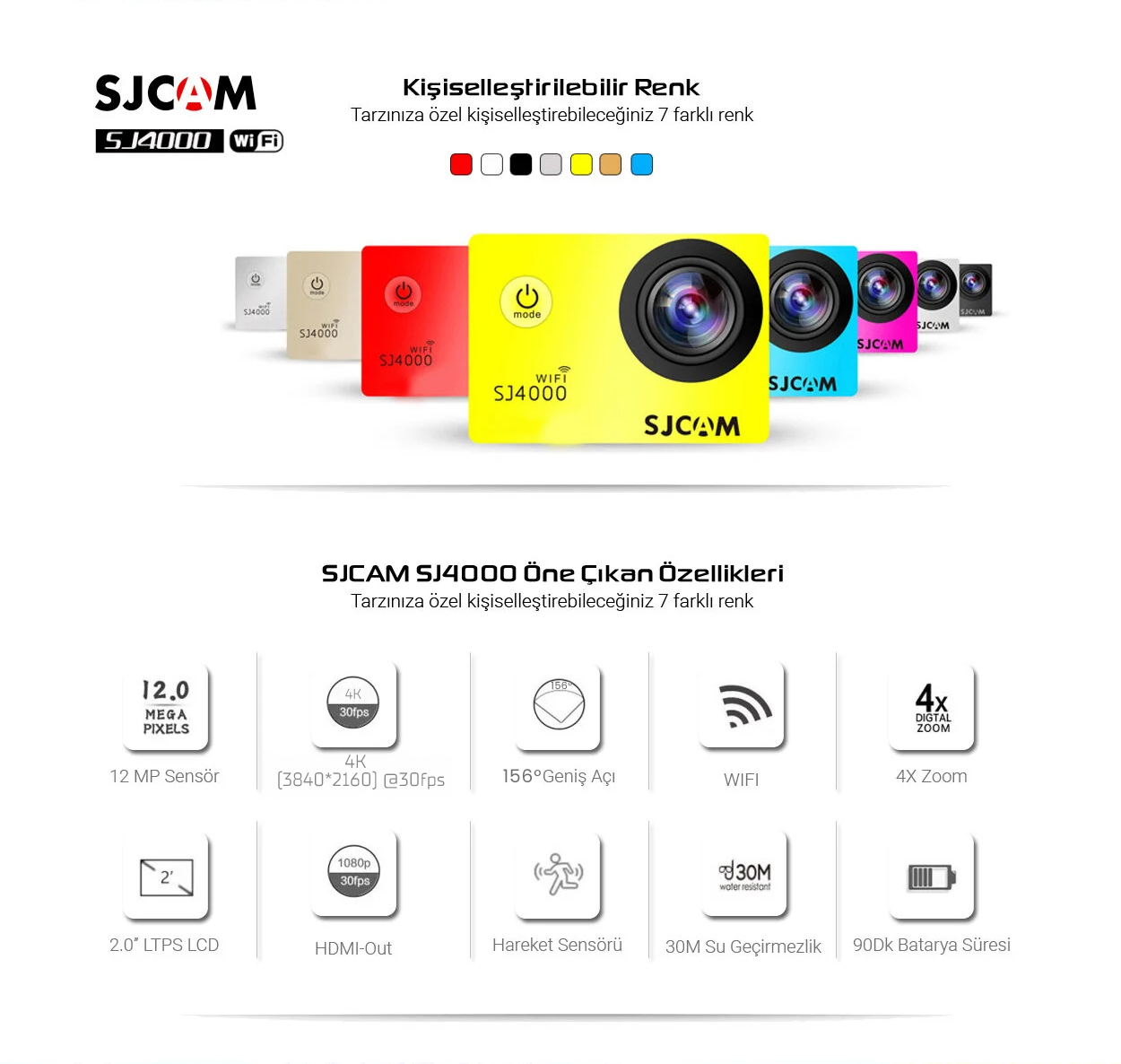 SJCAM SJ4000 WiFi 4K Aksiyon Kamerası'nı tüm spor ve hobi faaliyetlerinizde kullanabilirsiniz. Özel su altı kılıfı sayesinde 30 metre derinliğe kadar suya dayanıklıdır. Kablosuz bağlantı desteği sayesinde akıllı telefonlar üzerinden de kontrol edilebilmektedir. 4K 30 FPS çözünürlüğünde video çekebilen kamera, sosyal ortamlara yüksek çözünürlüklü yüklemeler yapabilmenizi sağlar. Kameranın netlik seviyesinin son derece yüksek olması, kayıtlarınızı daha gerçekçi hale getirir. Dilerseniz ürün yanında ekstra olarak satın alabileceğiniz vantuz aparatı ile SJCAM SJ4000 WiFi 4K Aksiyon Kamerası'nı araç içi kamera olarak da kullanabilirsiniz. Time lapse özelliği sayesinde ek bir programa ihtiyaç duymadan time lapse yapabilir ve mükemmel görüntüler yakalayabilirsiniz.