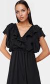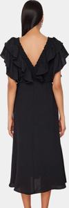 100% polyester kumaştan üretilen bu elbise, kırışmaya karşı dayanıklı ve kolay temizlenebilir. Lastikli bel detayı, gün boyu rahatlık sağlarken, volanlı kolları şık bir görünüm katıyor. A kesim ve midi boyu ile her vücut tipine mükemmel uyum sağlayan bu elbise, vücudunuzu sararak kusurlarınızı gizler. Elbisenin etek kısmı, belden açılan bir tasarımla hareket kabiliyetinizi artırıyor.