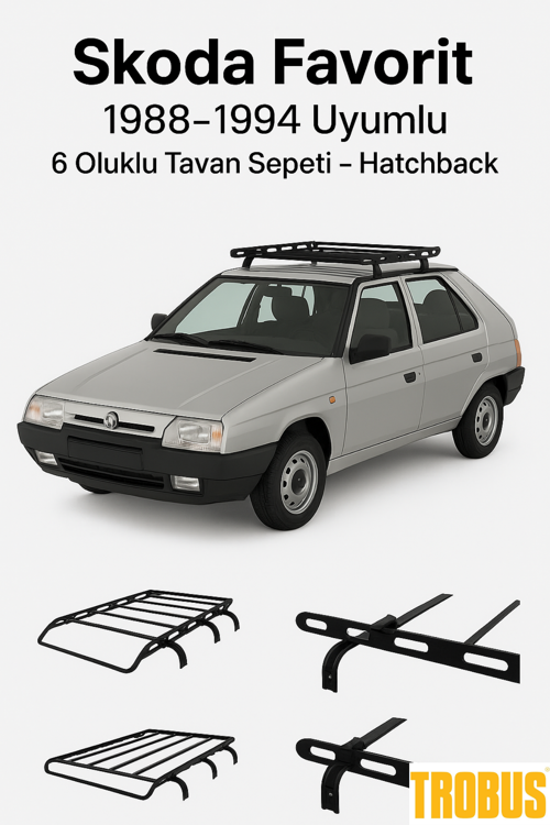 Skoda Favorit 1988-1994 hatchback ve benzeri oluklu tavanlı binek araçlar için tasarlanmış 6 ayaklı tavan sepetidir. Sepet ölçüsü yaklaşık 1 m x 1,5 m’dir ve tatil, kamp, günlük kullanımlarda ek yük alanı sağlar. Uyum için aracınızın yanlarında yağmur oluğu bulunmalıdır. Hatchback araçlarda tavan nispeten kısa olduğundan, tavan uzunluğunu ve oluk mesafesini sepet ölçüleriyle dikkatlice karşılaştırınız.