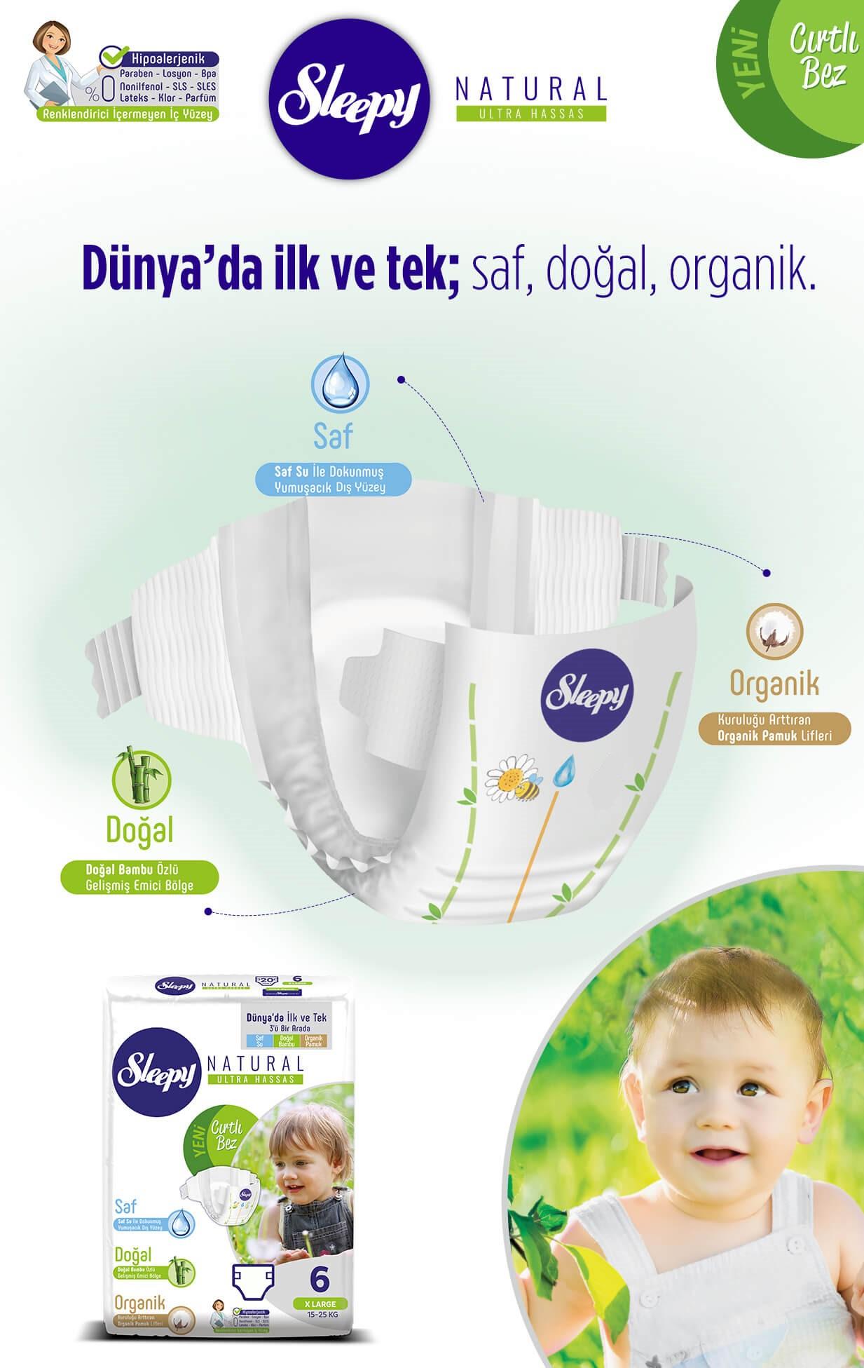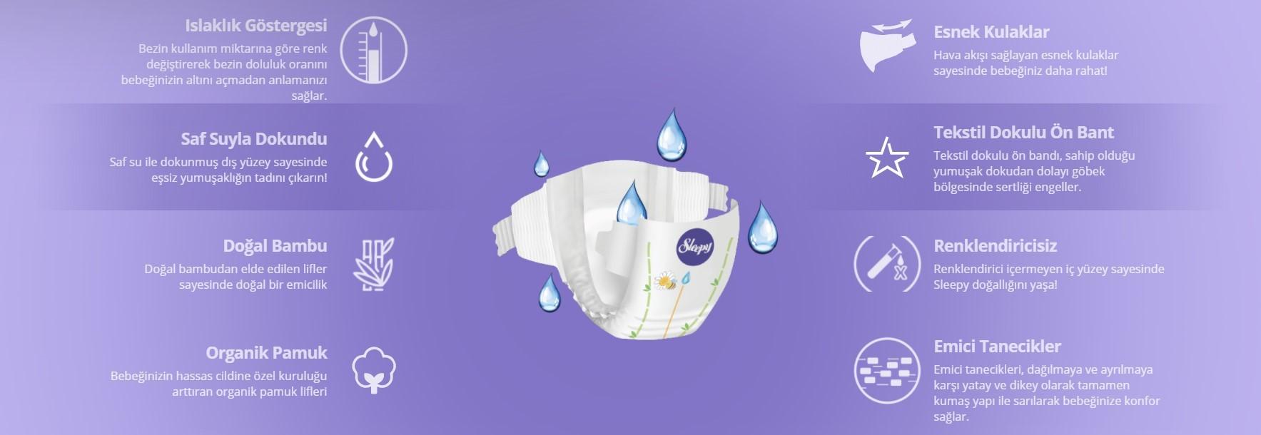 Sleepy Natural bantlı bebek bezi oldukça yumuşak yapıya sahiptir. Saf su ve bambu özlerinden üretilen ürün bebeğinizin hem cilt sağlığına olumsuz etkide bulunmaz hem de hareket kabiliyetinin kısıtlanmasının önüne geçerek rahat hareket etmesini sağlar.