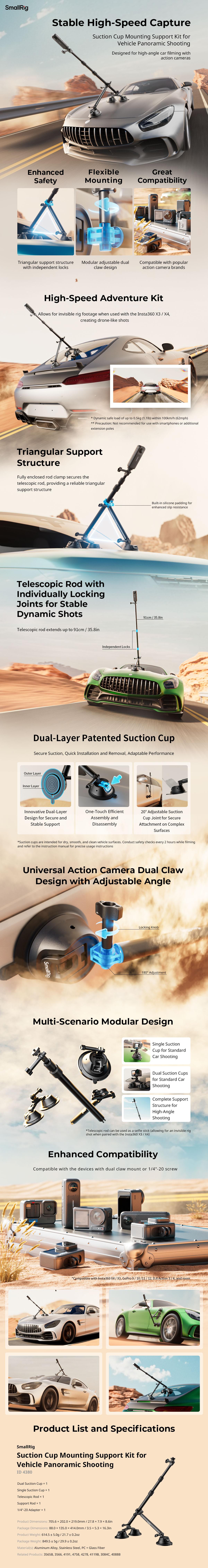 SmallRig Kamera Vakumlu Araç Montaj Seti Panoramik Çekimler İçin 4380, alçak irtifada drone benzeri çekim efektleri sağlayan panoramik kameralı araç çekimleri için özel olarak tasarlanmıştır. Bu montaj seti modüler bir tasarıma sahiptir ve çift vantuz, tek vantuz, teleskopik çubuk, destek çubuğu ve 1/4"-20 adaptör içerir. Dayanıklı alüminyum alaşımdan üretilen bu montaj seti, piyasadaki aksiyon kameralarının çoğuna uyum sağlamak için 0,5 kg / 1,1 lb'ye kadar destekleyerek stabilite ve uzun ömür sağlar. Vantuzların tek dokunuşlu tasarımı, hızlı montaj ve sökme işlemine olanak tanırken, patentli çift katmanlı vantuz tasarımı, çekim ihtiyaçlarınız için güvenli ve sabit destek sağlar. Vantuz bağlantı eklemlerinde 20° ayarlanabilir aralıkla, çok yönlü çekim açıları için montajı kavisli yüzeylere kolayca takabilirsiniz. Teleskopik çubuk 28 cm'den (11 inç) 91 cm'ye (35,8 inç) kadar uzanır ve çubukları küçültmeden sabit ve dinamik çekim için her bölümde bir düğme kilitleme mekanizmasına sahiptir. Tamamen kapalı bir çubuk kelepçesiyle teleskopik çubuğa güvenli bir şekilde sabitlenen destek çubuğu, çalışma sırasında ekipman güvenliğini artıran güvenilir bir üçgen destek yapısı oluşturur. Evrensel bir aksiyon kamerası çift pençe tasarımı, çoklu eklemler hızlı eğim ayarlamalarına izin vererek çekim verimliliğini en üst düzeye çıkarır. Kitin montaj seçenekleri arasında çift pençe ve 1/4"-20 vida bulunur ve Insta360 X4 / X3, GoPro12 / 11 / 10 / 9, DJI action 4 / 3 ve daha fazlası gibi popüler aksiyon kamerası markalarıyla uyumluluğu garanti eder. Kitin modüler tasarımı, çeşitli çekim senaryoları için bileşenlerin birden fazla kombinasyonuna izin verir. Tek veya çift vantuzların her ikisi de standart araba çekimi için aksiyon kameralarının doğrudan montajı için çift pençe arayüzlerine sahiptir, teleskopik çubuk aynı zamanda bir selfie çubuğu olarak da kullanılabilir.