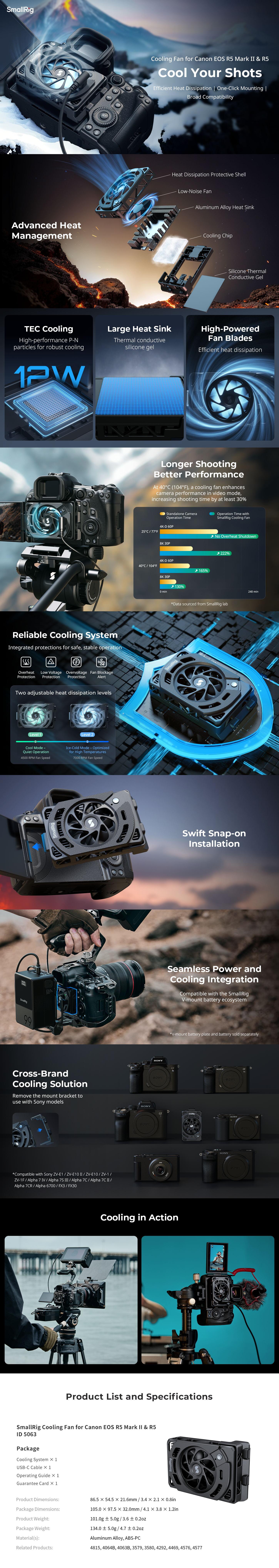 Canon EOS R5 Mark II ve R5 5063 için SmallRig Soğutma Fanı, Canon aynasız kameralardaki aşırı ısınma sorunlarını gidermek ve uzun süreli yüksek kaliteli video kayıt seanslarına olanak sağlamak için tasarlanmıştır. 7000 RPM fanı TEC soğutma teknolojisiyle eşleştiren gelişmiş soğutma sistemi, optimum ısı dağılımını sağlar ve kameranın aşırı ısınmasını önler. Çift hızlı fan, çeşitli çekim senaryolarına uyum sağlamak için yüksek hızlı ve düşük hızlı modlara sahiptir. Aletsiz takma tasarımı, hızlı kurulum ve çıkarma olanağı sağlayarak hem fana hem de kameranın LCD ekranına kolay erişim sağlar. Ayrıca, Canon, Sony ve diğer aynasız kameraları takmak için bir montaj braketi ile birlikte gelir. Soğutma fanı, verimli soğutma ve güç kaynağı için V montajlı pil montaj plakası kitleri (ID 4064B , 4063B ) ve V montajlı pillerle (ID 3579 , 4608 , 4292 ) de uyumludur.