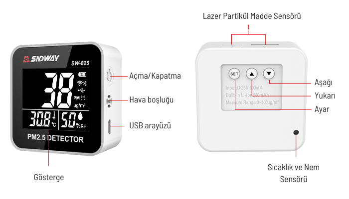 - SW-825, yüksek ölçüm hassasiyeti ve hızlı tepki süresi sunan "PLANTOWER Lazer Partikül Madde Sensörü" ile donatılmıştır. Bu gelişmiş sensör, PM2.5 partiküllerini gerçek zamanlı ve güvenilir şekilde tespit ederek doğru hava kalitesi takibi sağlar.
