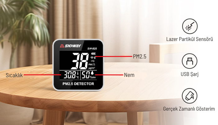 SNDWAY SW-825, iç ve dış ortamlardaki PM2.5 partikül madde yoğunluğunu gerçek zamanlı olarak ölçen şarjlı ve taşınabilir bir hava kalitesi monitörüdür. Net ve okunabilir LED ekranı, bulunduğunuz ortamdaki hava kirliliği seviyesini anlık olarak görmenizi sağlar ve sağlıklı kararlar almanıza yardımcı olur. Şarjlı bataryası sayesinde kabloya bağlı kalmadan kullanılabilir, Mini boyutu ve şık tasarımıyla her yere kolayca taşınır. Ev, ofis, otomobil içi, açık alanlar ve kapalı yaşam alanlarında pratik şekilde kullanım sunar.