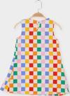 Ürün Özellikleri: Enseden düğmeli bisiklet yaka, sıfır kol, baskılı, etek yanları pileli, dama detaylı dokuma elbise