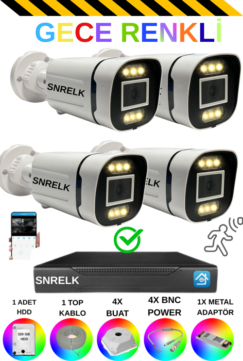 *SNRELK IP 66 KASA SAYESİNDE SU GEÇİRMEZ ÖZELLİĞE SAHİPTİR. * 1080P ÇÖZÜNÜRLÜĞÜ İLE NET GÖRÜNTÜ VERİR. *6X YENİ NESİL WARM LEDLER İLE GECE RENKLİ GÖRÜNTÜYE SAHİPTİR. *GENİŞ AÇIYA SAHİPTİR. *2 YIL İTHALATÇI GARANTİLİDİR. SET İÇERİĞİNDE BULUNANLAR * 2 ADET 6X WARM LEDLİ DIŞ MEKAN BULLET KAMERA *4 KANAL DVR (KAYIT CİHAZI) 1 ADET *2 ADET BNC KONNEKTÖR *2 ADET BNC-POWER *2 ADET MONTAJ BUATI *1 TOP CCTV KABLO *1ADET METAL ADAPTÖR *1 ADET ENERJİ KABLOSU(METAL ADAPTÖR) İÇİN *1 ADET 320GB HDD (HARD DİSK) *KAYIT CİHAZI ADAPTÖRÜ VE MOUSE KUTU İÇERİĞİNDE MEVCUTTUR. * SNRELK ÜRÜNLERİMİZ GECE NET GENİŞ AÇILI VE RENKLİ BİR GÖRÜNTÜYE SAHİPTİR.