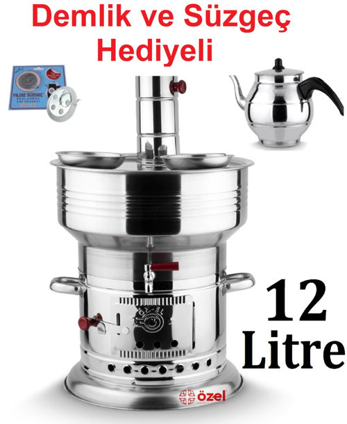 12 Litre Paslanmaz Krom Odunlu Kömürlü Çay Semaveri Odunlu Kömürlü Semaver DEMLİK HEDİYELİ 12+1 Lt