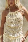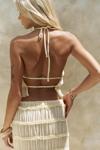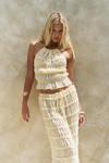 İnce askılı, göğüs kısmı şeritl lastikli crop bluz. Hafif transparan yapıılı ve dokulu kumaş.