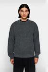 Ürün Özellikleri: Oversize kalıp, %100 akrilik materyal, düz desen, bisiklet yaka, standart uzun kol, triko kumaş, antrasit renk, baskısız tasarım.