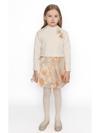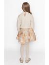 Üst beden simli örme kumaştan etek kısmı somon renkli çiçekli jakar kumaştan tasarlanmıştır