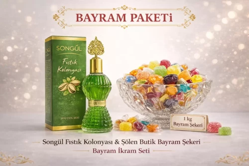 Bayram ikram paketi olarak hazırlanan Songül Fıstık Kolonyası ve karışık bayram şekeri seti, bayram ziyaretlerinde misafir ağırlamak için pratik bir ikram çözümü sunar. Kolonya ve bayram şekeri ikramı, Türk misafir ağırlama geleneğinin en bilinen bayram ikramlarından biridir. Misafir ikram seti olarak hazırlanan bu paket; kolonya şeker seti, bayram şekeri paketi ve misafir ikram paketi gibi geleneksel bayram ikramlıkları arasında yer alır. Bayram ziyaretleri, aile buluşmaları ve kahve ikramı yapılan sohbet ortamlarında kolonya ve bayram şekeri birlikte sunularak klasik bayram ikramı tamamlanır.