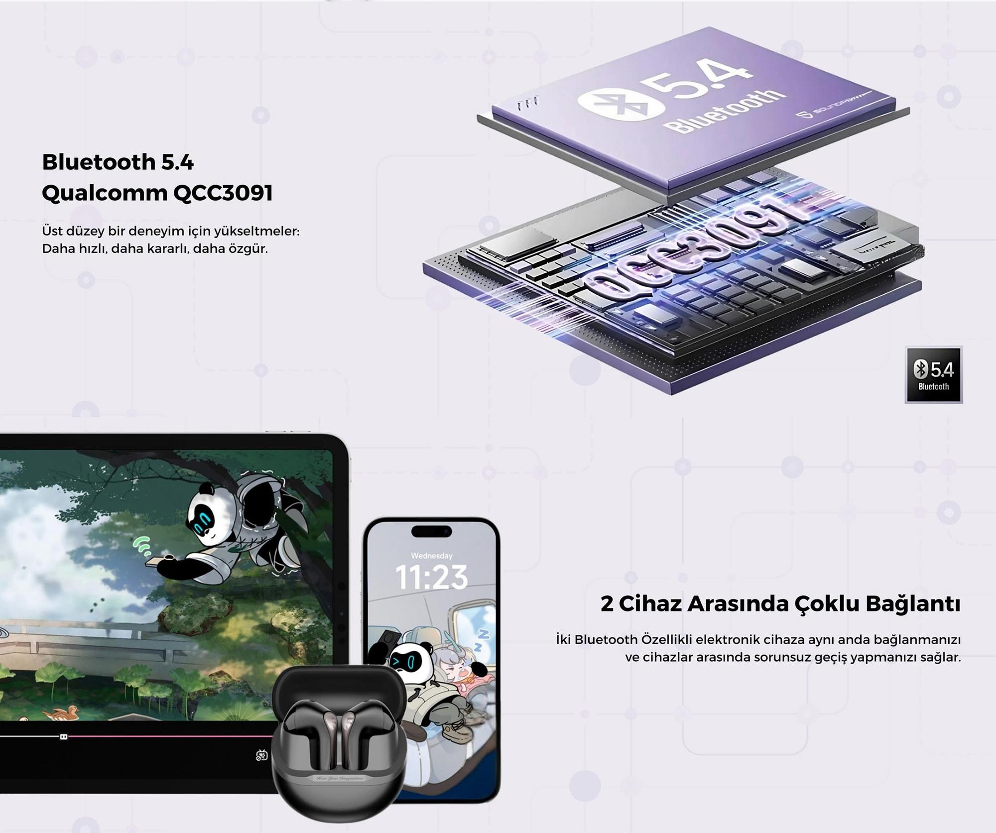 Bluetooth 5.4 teknolojisi ile daha hızlı, stabil ve düşük gecikmeli bağlantı imkanı sağlar.