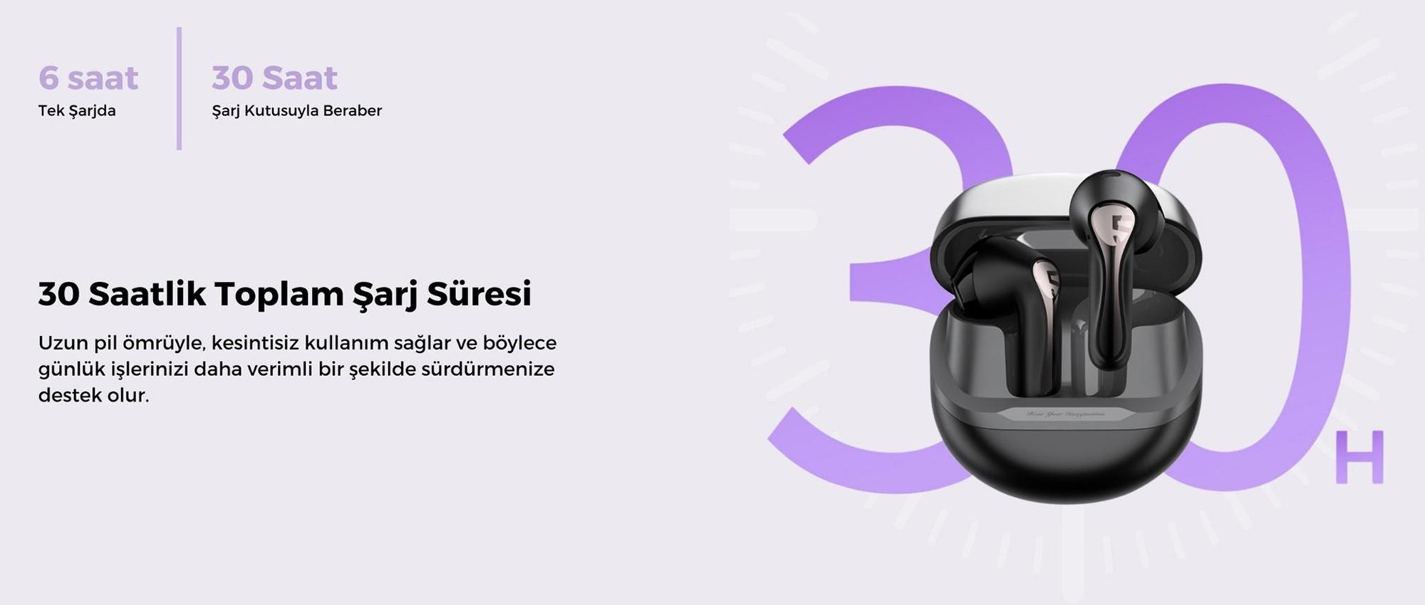 Kulaklık tek şarjla yaklaşık 6 saate kadar kullanım sağlar. Şarj kutusu ile birlikte toplamda 30 saate kadar çalma süresi sunar.