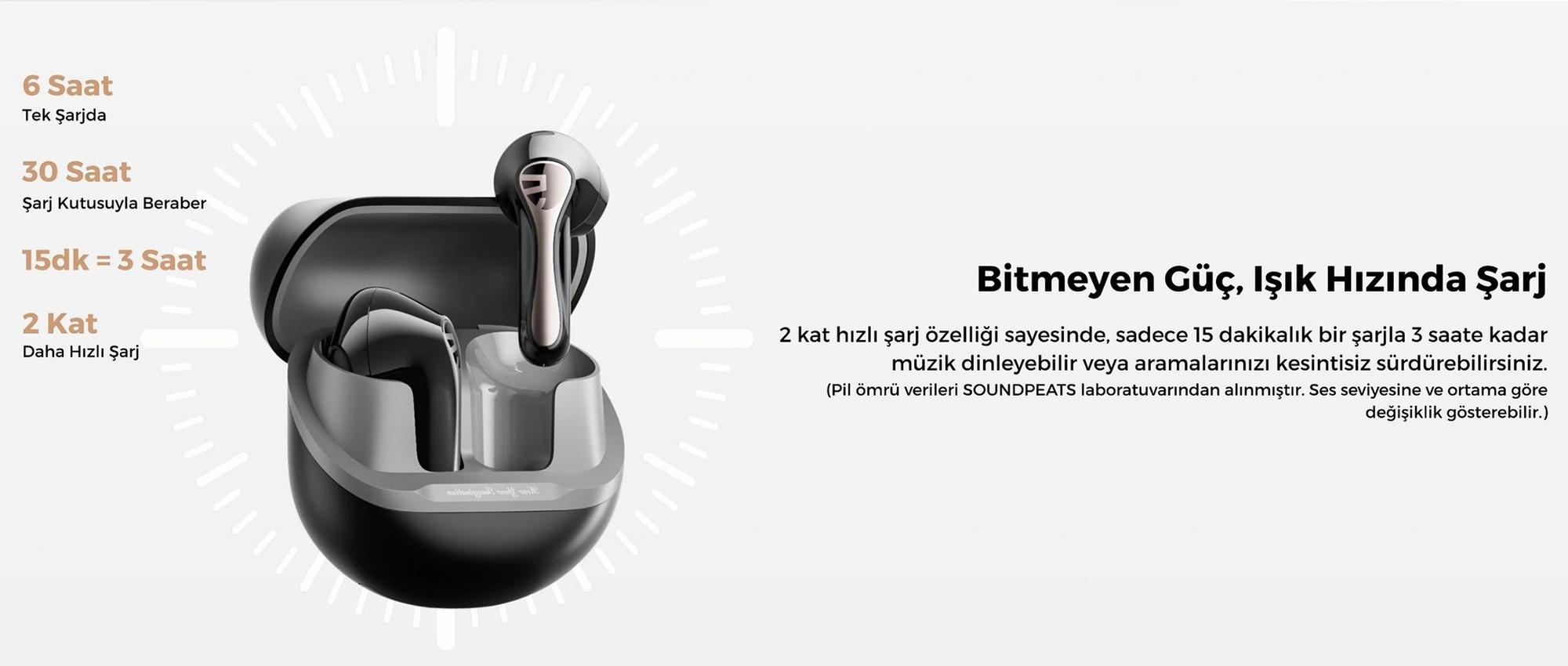 Her bir kulaklık ve şarj kutusunun toplamda 30 saate kadar kesintisiz kullanım imkanı vardır.