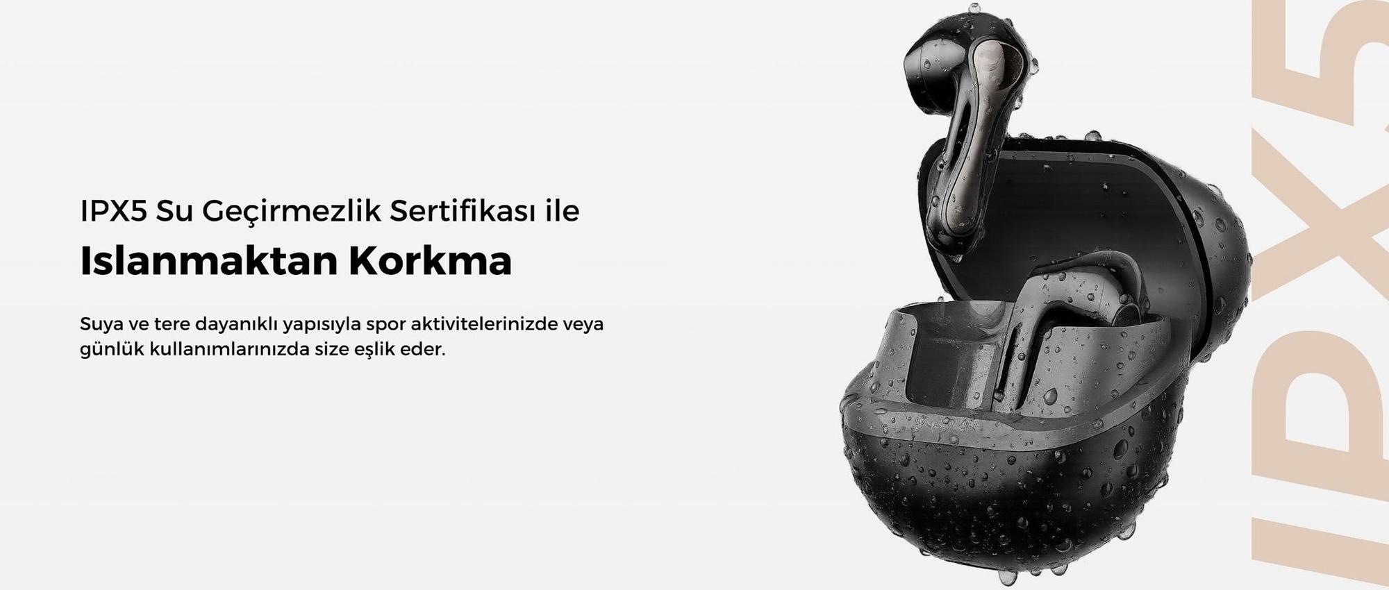 IPX5 sertifikası ile ter ve su sıçramalarına karşı dayanıklıdır, spor ve günlük kullanım için uygundur.