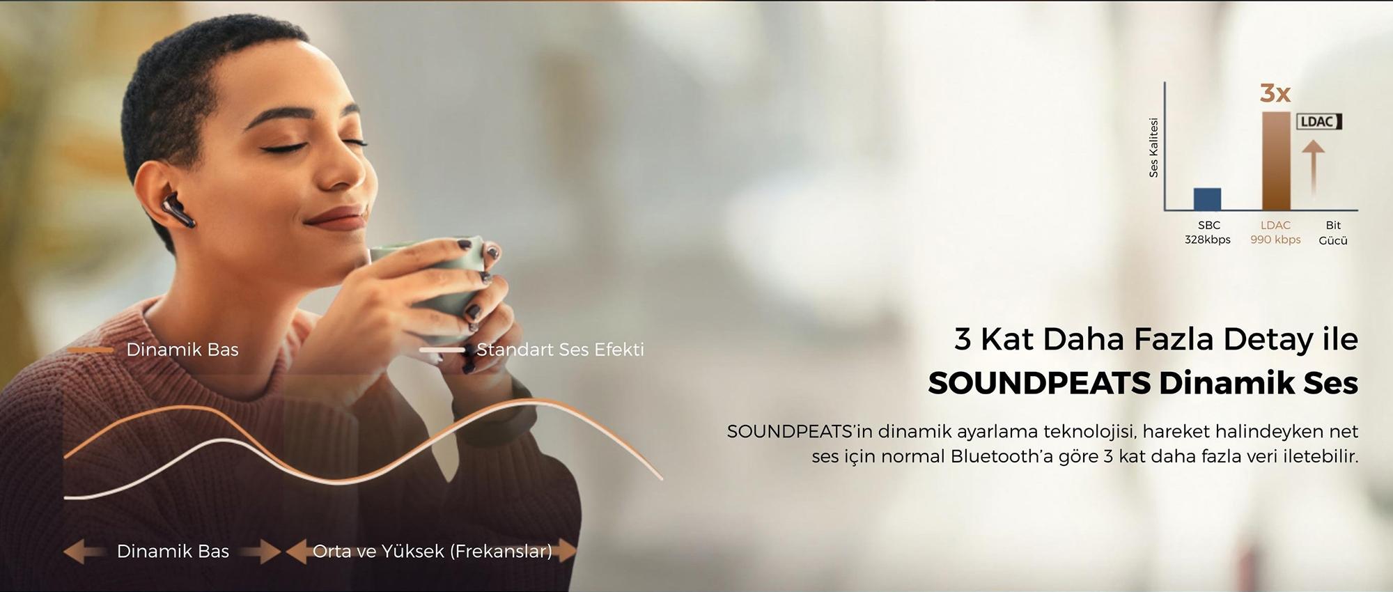 SOUNDPEATS Air5 Pro, Snapdragon Sound™ destekli Qualcomm® QCC3091 yonga seti, aptX Lossless ve LDAC codec’leri ile kablosuz kulaklıklarda ses kalitesini yeni bir seviyeye taşıyor. Hi-Res Audio Wireless sertifikası sayesinde müziği stüdyo kalitesine en yakın haliyle dinleyebilir, güçlü aktif gürültü engelleme ve düşük gecikme özellikleriyle hem eğlence hem de günlük kullanımda üstün bir deneyim yaşayabilirsiniz.