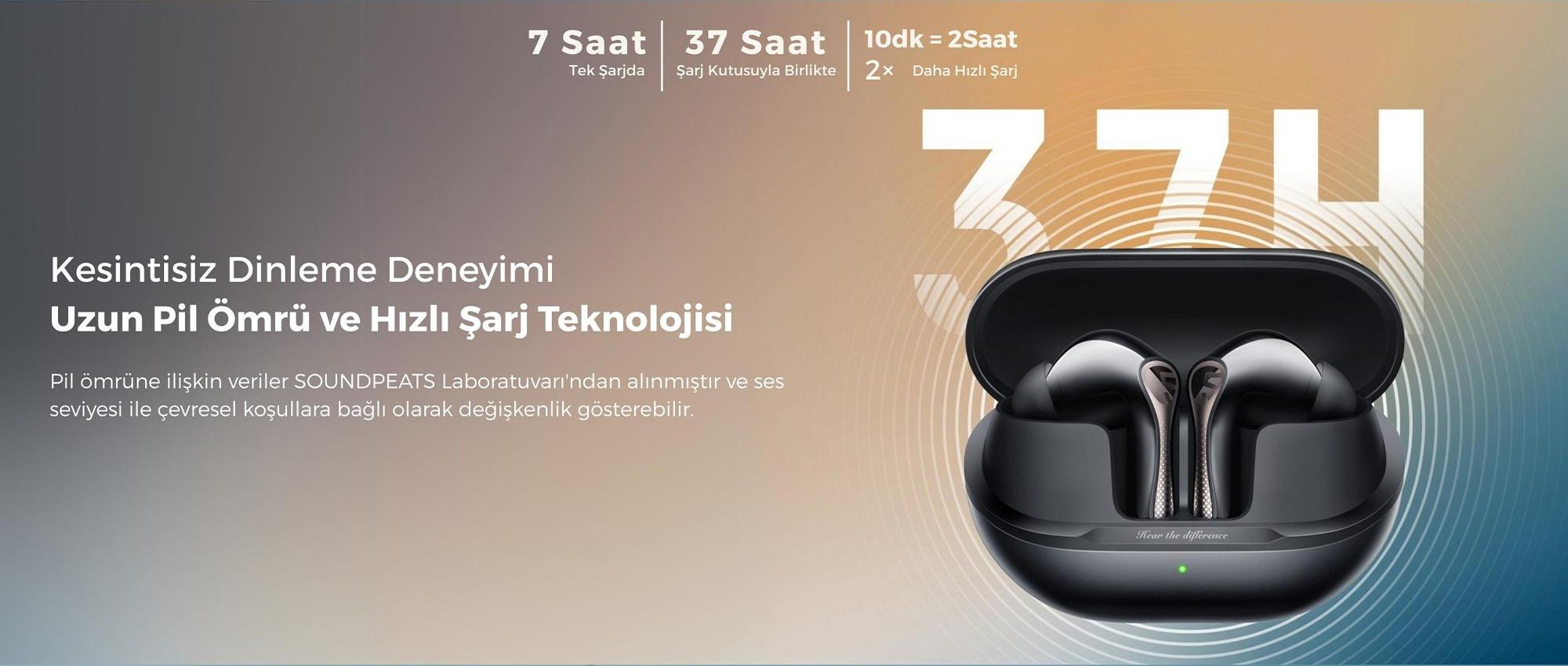 SoundPEATS Air5 Pro kulaklık kaç saat kesintisiz müzik dinleme süresi sunuyor?Kulaklıklar tek şarjla ANC kapalıyken yaklaşık 7.5 saate kadar kesintisiz kullanım sunar. Şarj kutusu ile birlikte toplamda 37 saate kadar çalma süresi elde edilebilir.