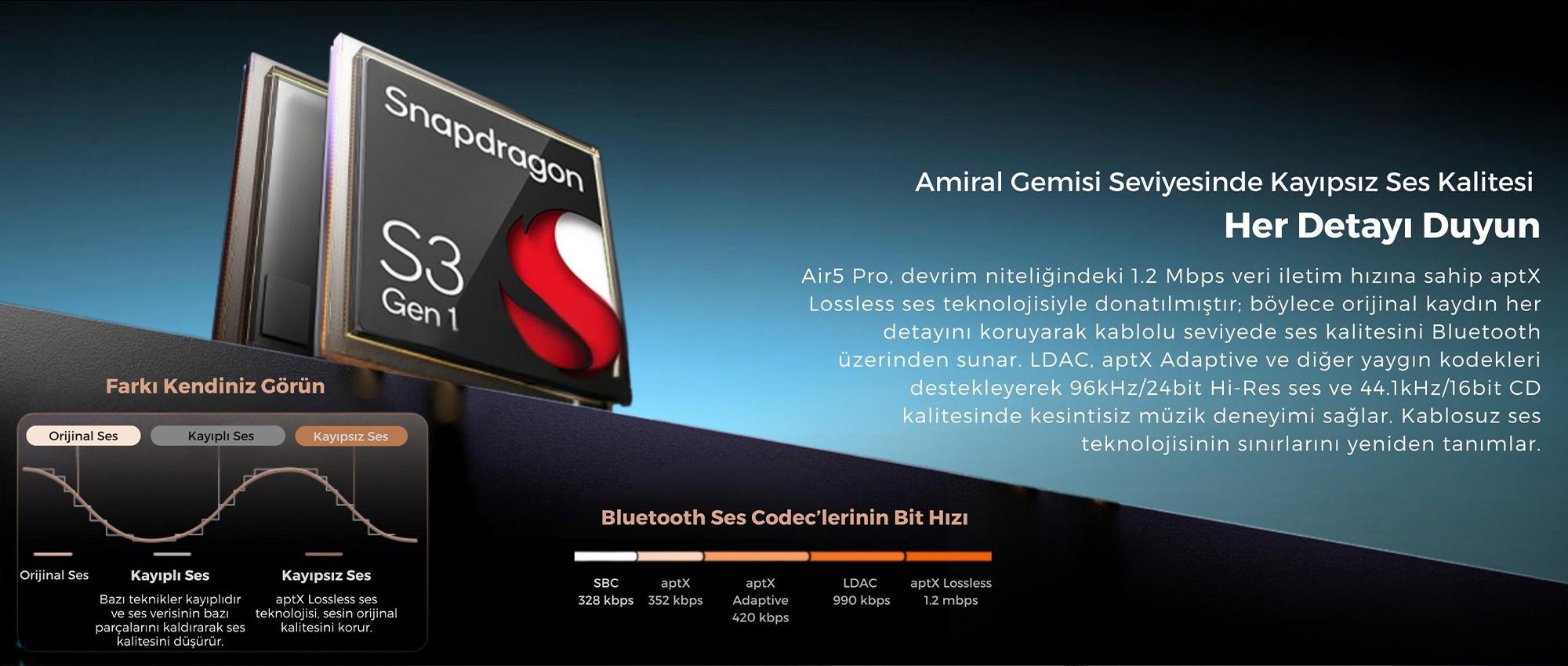 SOUNDPEATS Air5 Pro, Snapdragon Sound™ destekli Qualcomm® QCC3091 yonga seti, aptX Lossless ve LDAC codec’leri ile kablosuz kulaklıklarda ses kalitesini yeni bir seviyeye taşıyor. Hi-Res Audio Wireless sertifikası sayesinde müziği stüdyo kalitesine en yakın haliyle dinleyebilir, güçlü aktif gürültü engelleme ve düşük gecikme özellikleriyle hem eğlence hem de günlük kullanımda üstün bir deneyim yaşayabilirsiniz.