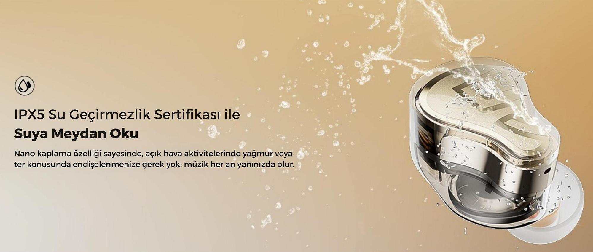 IPX5 sertifikası ile ter ve su sıçramalarına karşı dayanıklıdır, spor ve dış mekân kullanımı için uygundur.