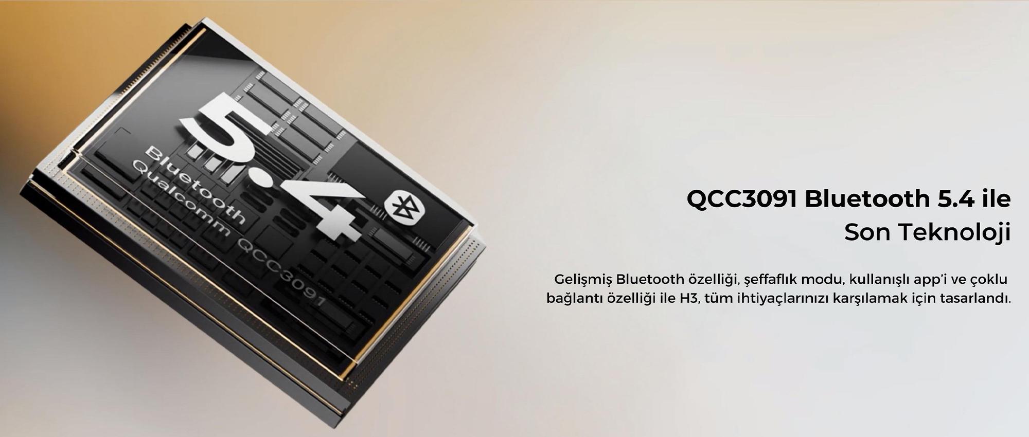 Bluetooth 5.4 sürümü ve Qualcomm QCC3091 chipset ile güçlü, hızlı ve stabil bağlantı sağlar. Bluetooth profilleri HSP, HFP, A2DP ve AVRCP’yi destekler.