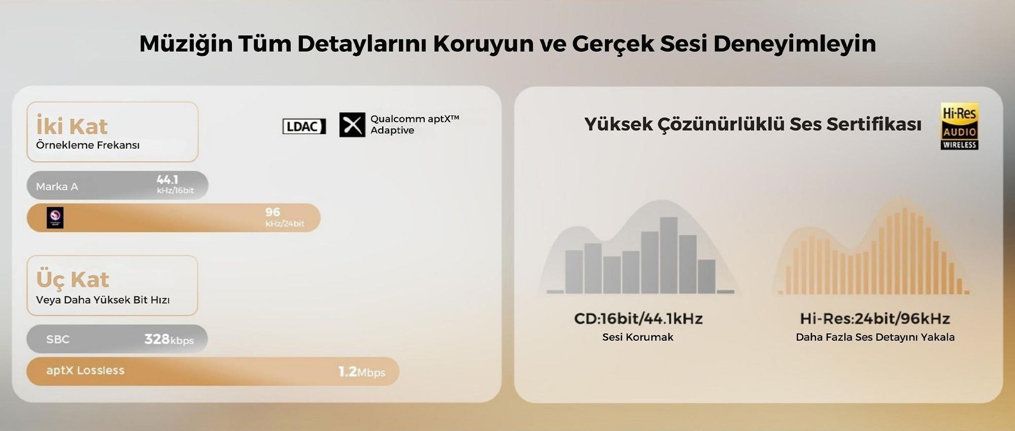 SBC, AAC, LDAC, aptX, aptX Adaptive ve aptX Lossless codec’leri ile yüksek kaliteli ses deneyimi sunar.
