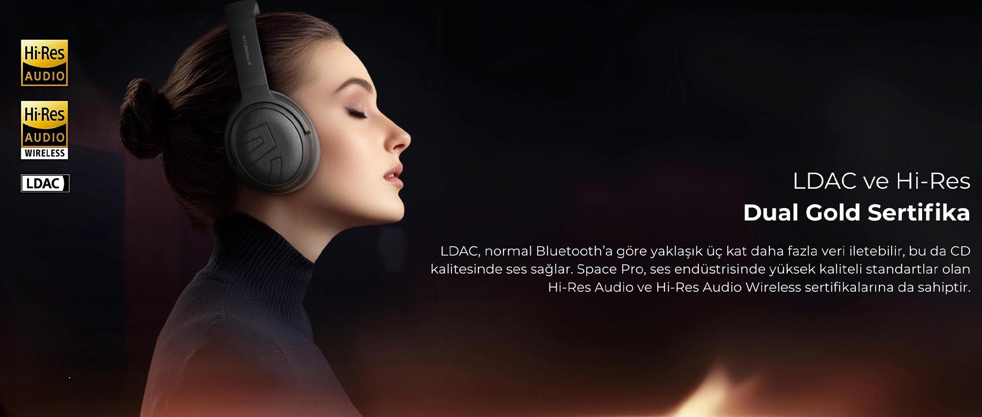 LDAC, yüksek çözünürlüklü ses aktarımı sağlar; böylece daha zengin, detaylı ve net ses deneyimi sunar.