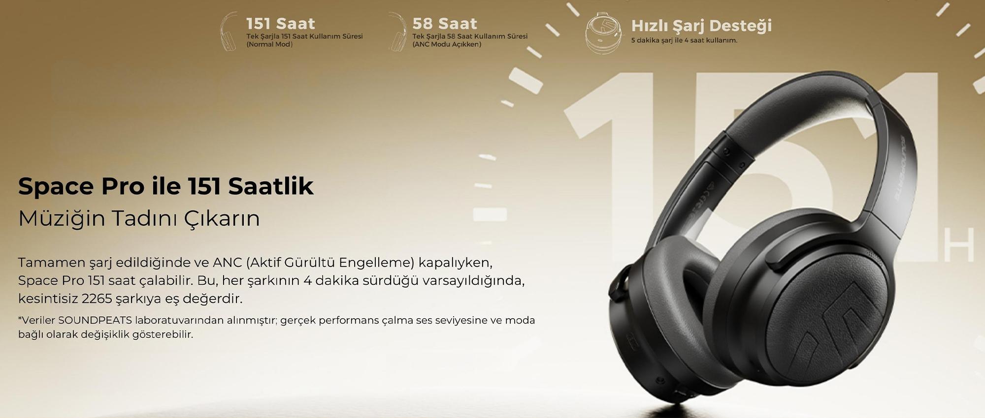 SoundPEATS Space Pro, etkileyici 151 saate kadar çalma süresiyle uzun kullanım sunan, yüksek kapasiteli 1100 mAh bataryaya sahip kulak üstü bir kulaklıktır. Bluetooth 5.4 teknolojisi ve BT8931H chipseti ile kararlı bağlantı sağlarken; AAC, SBC ve LDAC codec desteği ile güçlü ve net ses performansı sunar. Fiziksel buton kontrollü, sağlam yapısı ve 282 gramlık ağırlığı ile günlük kullanımda konfor ve dayanıklılığı bir araya getirir. USB-C şarj girişiyle modern ve pratik bir deneyim sunar.