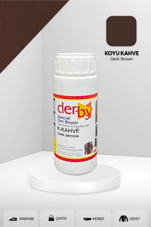 Derby Special Deri Mont ve Eşyalar için kullanılan su bazlı deri boyasıdır. Bu ürün ile deriden üretilen mont, çanta, cüzdan, ayakkabı ve benzeri deri eşyaları boyayarak yenileyebilirsiniz. Gerçek ve suni derilere kullanılabilir. Suya ve yağmura karşı dirençlidir.