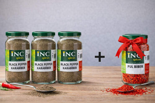 - Üçlü karabiber seti, mutfak lezzetlerinizi zenginleştirmek için ideal bir seçenektir.; - Pul biber hediyesi ile, baharat koleksiyonunuza özel bir dokunuş ekler.; - Tek ebat tasarımı sayesinde, her türlü baharat kabına kolayca uyum sağlar ve düzenli bir mutfak düzeni oluşturur.; - IN menşei garantisiyle, kaliteli ve güvenilir bir ürün sunar.
