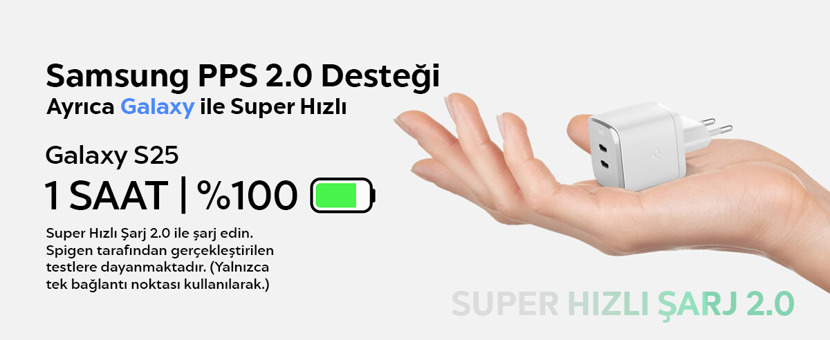 Samsung PPS (25W) ve PPS 2.0 (45W) Super Hızlı Şarjı Kullanabilmeniz için Bu Protokolü Destekleyen Kablo ile Beraber Kullanılması Gerekmektedir. Spigen USB-C 60W / 100W Şarj / Data Kabloları Samsung PPS ve PPS 2.0 Super Hızlı Şarjı Destekler.