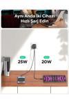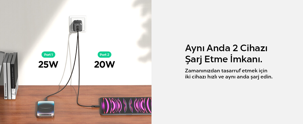 Çift Güç, Tek Adaptör: Aynı anda iki cihazı zahmetsizce şarj edin. 25W güç sağlayan birinci port ile telefonunuzu hızlıca şarj ederken, 20W çıkış sunan ikinci port sayesinde kulaklık, saat gibi aksesuarlarınızı da kesintisiz enerjiyle buluşturun. Tek bir USB-C bağlantısı ile 45W PD ve 45W PPS Super Fast Charging 2.0 sunar. Çift şarj esnasında cihazlarınız için 25W ve 20W güç dahil olmak üzere toplam 45W gücü destekler. Tüm cihazlarınız için tek adaptör yeter!