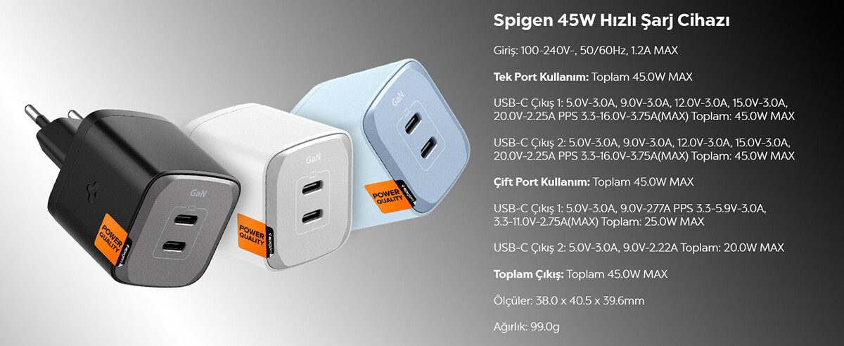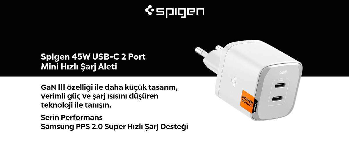 Neden Spigen 45W USB-C 2 Port Mini Hızlı Şarj Aleti Samsung PPS 2.0 / Isı Düşürücü GaN III Destekli Akım Korumalı Beyaz Güç Adaptörü / Şarj Cihazı?